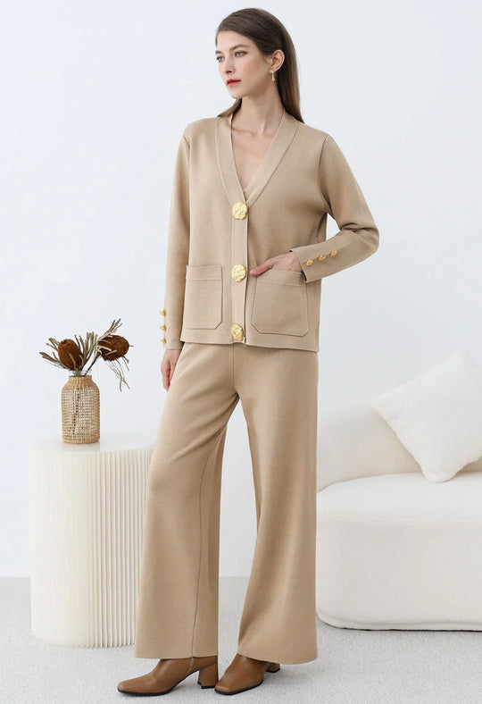 Craquez pour l’élégance discrète de notre ensemble en tricot. Avec ses boutons dorés et ses poches plaquées, il marie confort et raffinement pour un look cosy et sophistiqué.