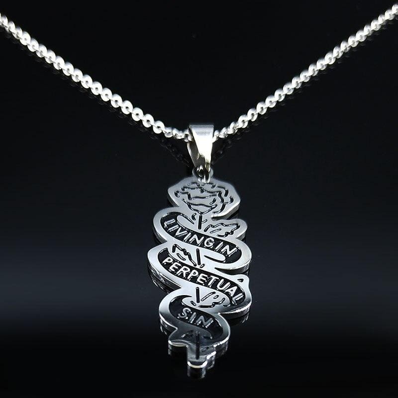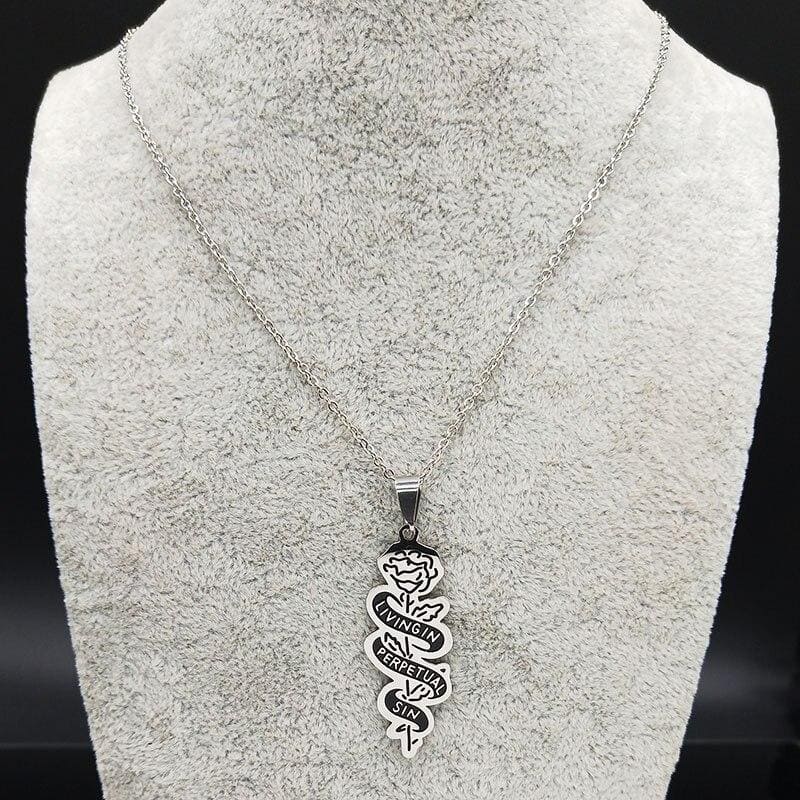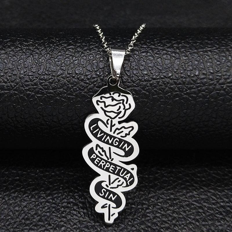 Perfect for accessorizing your gothic style, this pretty black rose gothic necklace charms with its simplicity and delicacy. Its fine 20-inch chain supports a black rose-shaped silver pendant. The medallion bears the inscription “living in perpetual sin.” This steel piece of jewelry is delicate, seductive, and feminine. It goes well with a black gothic top, a chic gothic outfit, or a romantic or sexy gothic look! Guaranteed to shine for life!