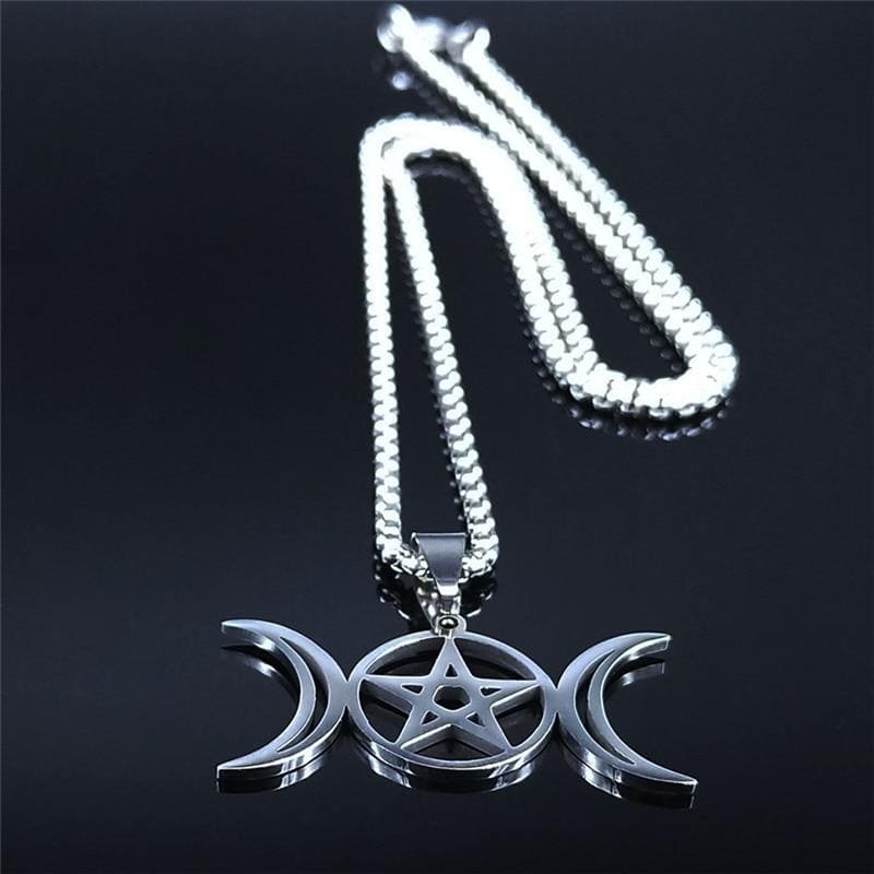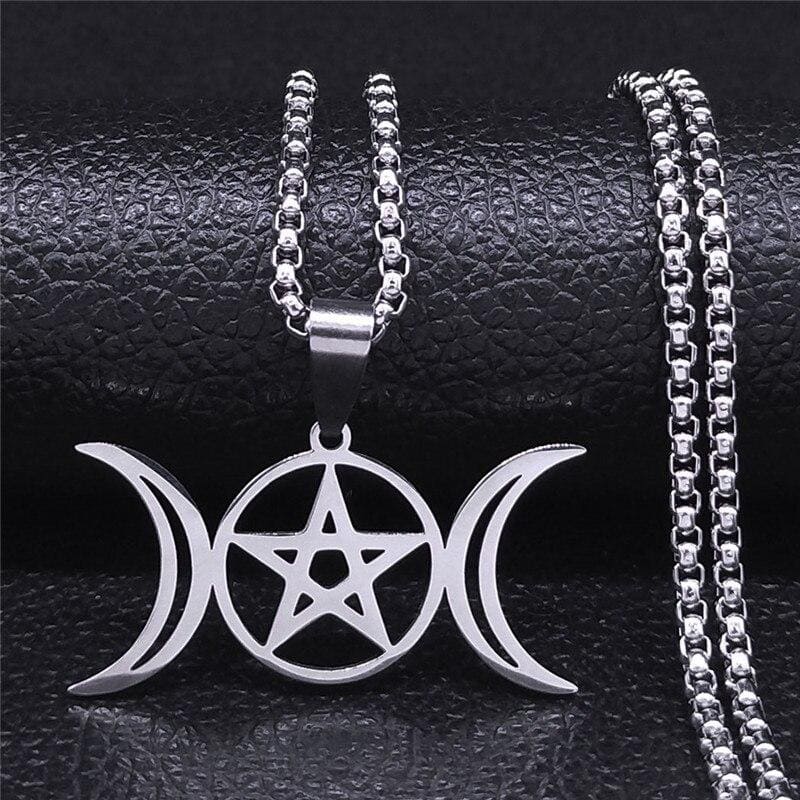 Accessorize your gothic outfit with this Wicca necklace. It features a hollow pendant with a triple moon and pentagram motif. The pendant is mounted on a 50 cm long chain. The necklace is made of stainless steel, a metal that does not rust or oxidize and will remain shiny over time. Perfectly in keeping with the theme, this is an ideal piece of jewelry to accessorize all kinds of feminine gothic outfits and add extra charm.