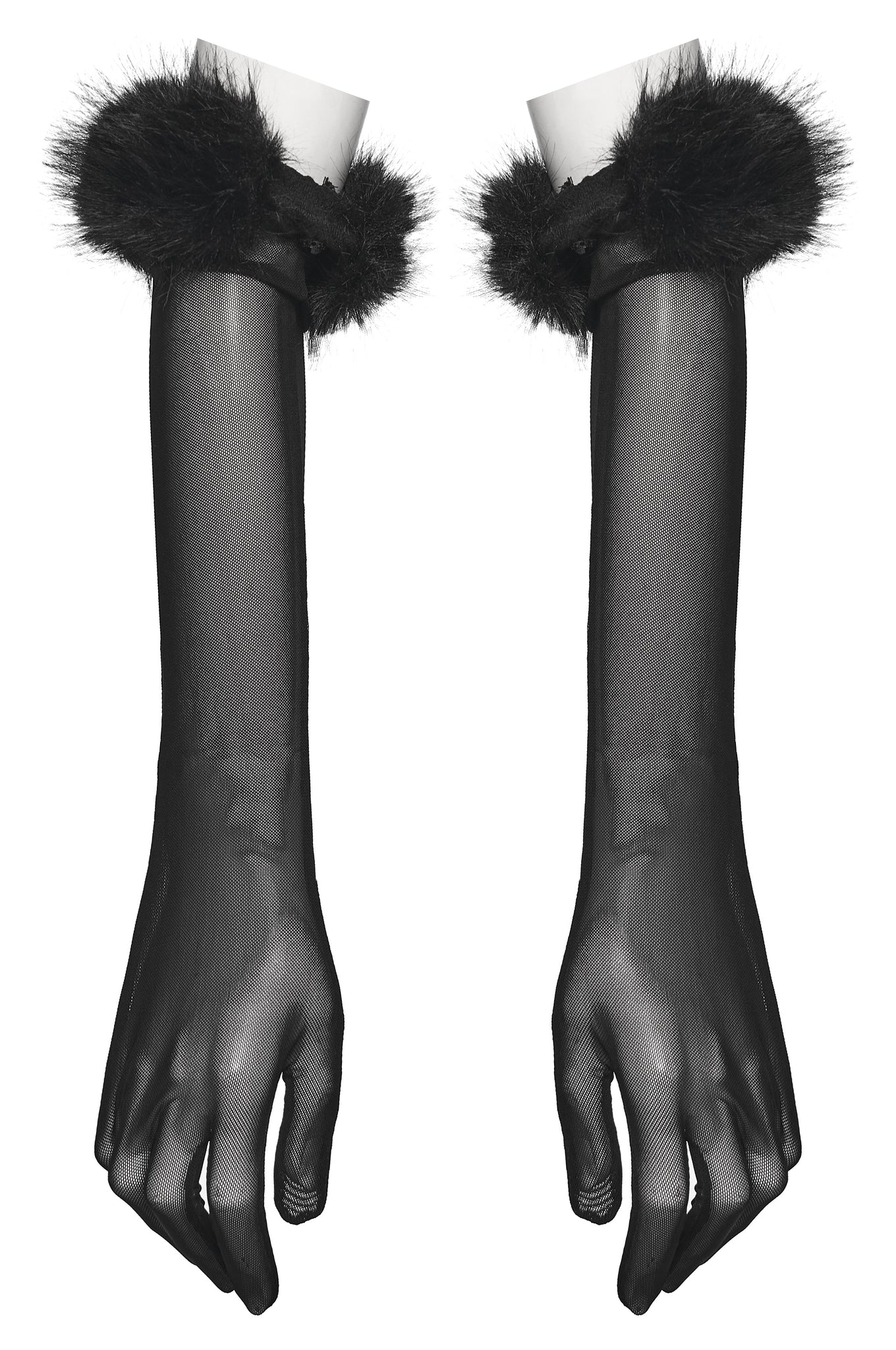 - Opera-length black mesh gloves with dramatic faux fur cuffs